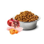 Deboned chicken, dehydrated chicken (source of glucosamine & chondroitin sulfate), potato, chicken fat (preserved with mixed tocopherols), dehydrated egg product, herring (source of glucosamine & chondroitin sulfate), dehydrated herring (source of glucosamine & chondroitin sulfate), herring & salmon oil blend (preserved with mixed tocopherols), chicken protein concentrate, dried carrots, sun-cured alfalfa meal, chicory root extract, fructooligosaccharide, yeast extract (source of mannan-oligosaccharides), dehydrated pomegranate, dehydrated apple, dehydrated spinach, psyllium seed husk, dehydrated blackcurrant berry, dehydrated sweet orange, dehydrated blueberry, salt, brewers dried yeast, turmeric, vitamin A supplement, vitamin D3 supplement, vitamin E supplement, ascorbic acid, niacin, calcium pantothenate, riboflavin, pyridoxine hydrochloride, thiamine mononitrate, biotin, folic acid, vitamin B12 supplement, choline chloride, beta-carotene, zinc proteinate, manganese proteinate, iron proteinate, copper proteinate, selenium yeast, DL-methionine, taurine, L-carnitine, aloe vera gel concentrate, green tea extract, rosemary extract.